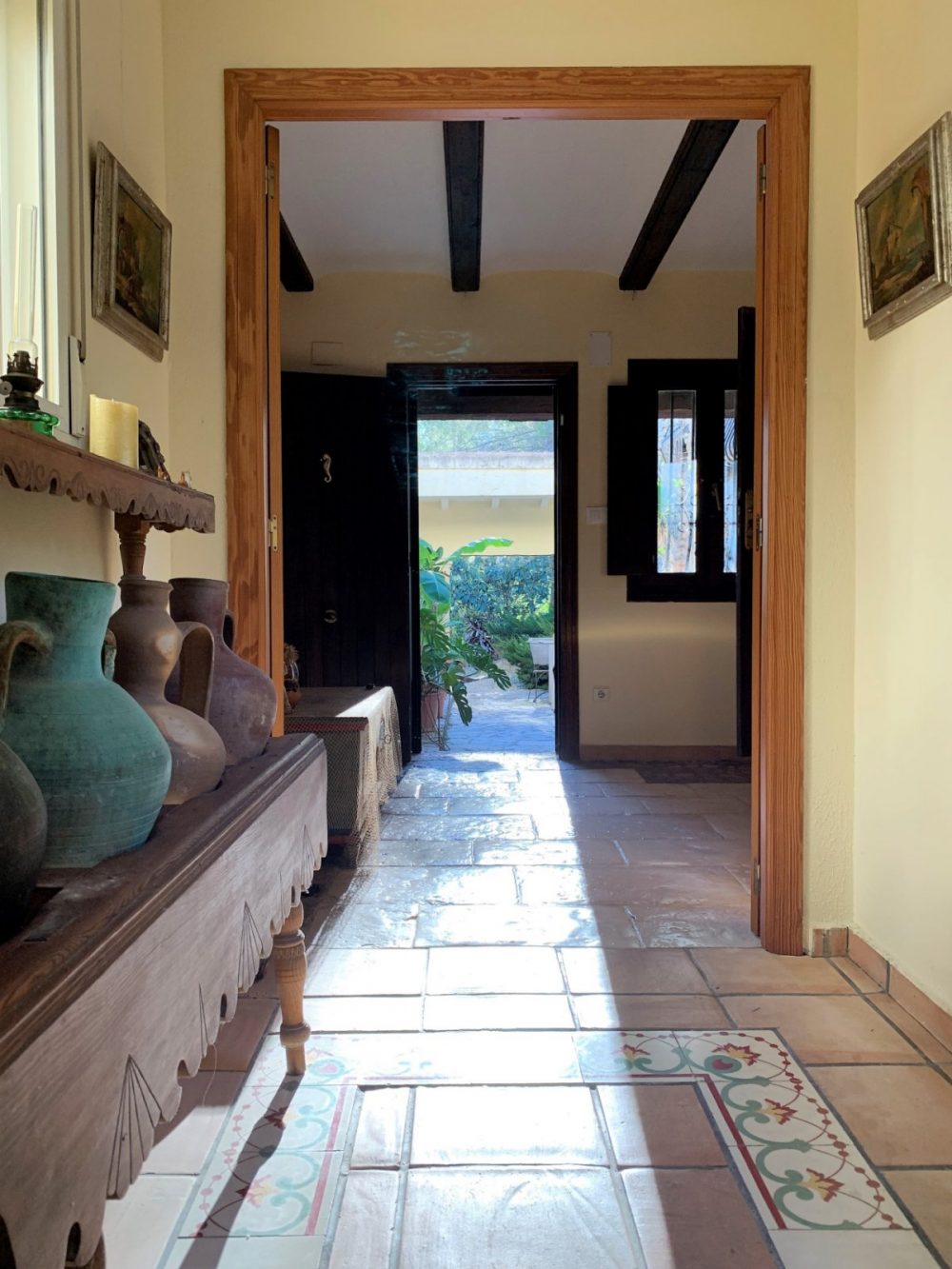 Drei Portale und die sich durch den Pinienwald schlängelnden Zufahrtswege führen zum Anwesen. Der beeindruckende Haupteingang wird von einem malerischen Innenhof gesäumt und öffnet sich zu dem im Jahre 2002 mit viel Liebe zum Detail im Fincastil erbauten Teil. Ein weitläufiges Wohn- und Esszimmer mit angrenzendem Duschbad vermittelt das Ambiente eines feudalen Landsitzes mit dicken Aussenwänden, einer hohen Holzbalkendecke und vielen anderen charakteristischen Elementen. Daneben liegt die modern, erst kürzlich eingebaute Küche und ein grosses Schlafzimmer mit einem stilvollen en-suite Bad. Der modern gehaltene Bereich bietet ein grosses und elegantes Badezimmer mit Wanne und Yet-Dusche, Schlafzimmer, kleiner Weinkeller und Zugang zur Garage und Waschraum.